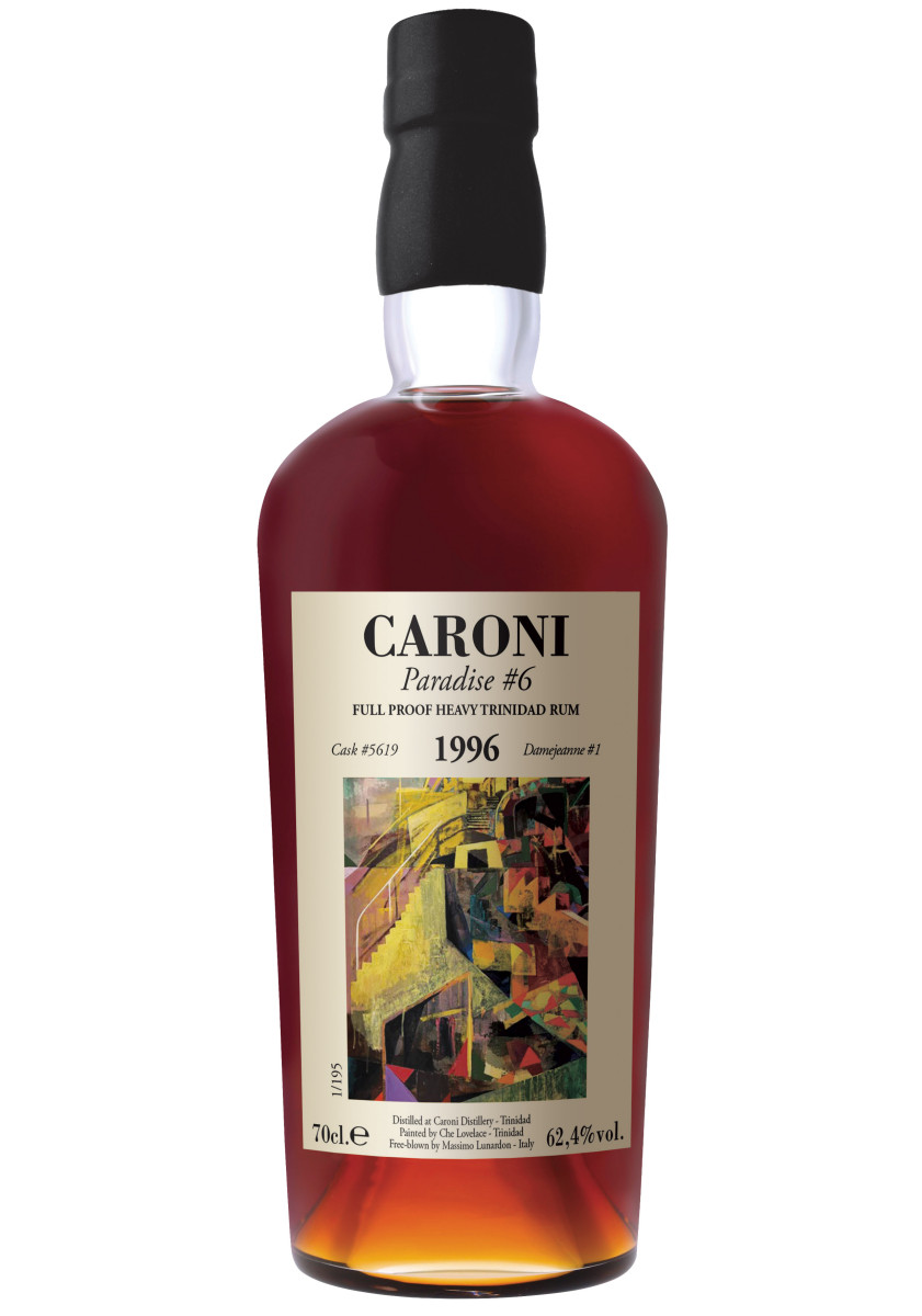 Caroni, qui a commencé ses activités en 1918, était la distillerie d’État de Trinidad. Jusqu’à sa fermeture en 2002, elle produisait des “light” et des “heavy rums”, principalement pour des assemblages, ne produisant que rarement des embouteillages sous son propre nom. Les étiquettes des Caroni Paradise sont illustrées des acryliques réalisés par le peintre Che Lovelace, né en 1969 à Trinité-et-Tobago.