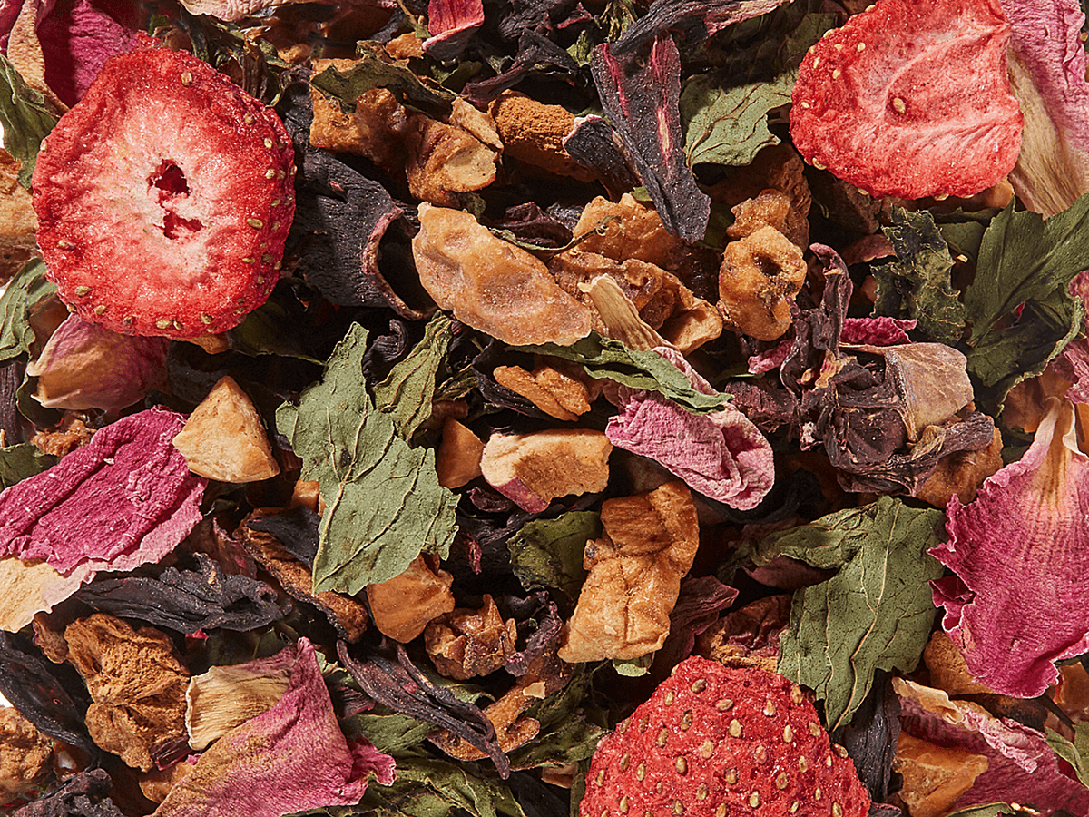 Morceaux de pomme, fleurs d’hibiscus, menthe poivrée feuilles(5%) arôme naturel, fraises déshydratées, pivoine.