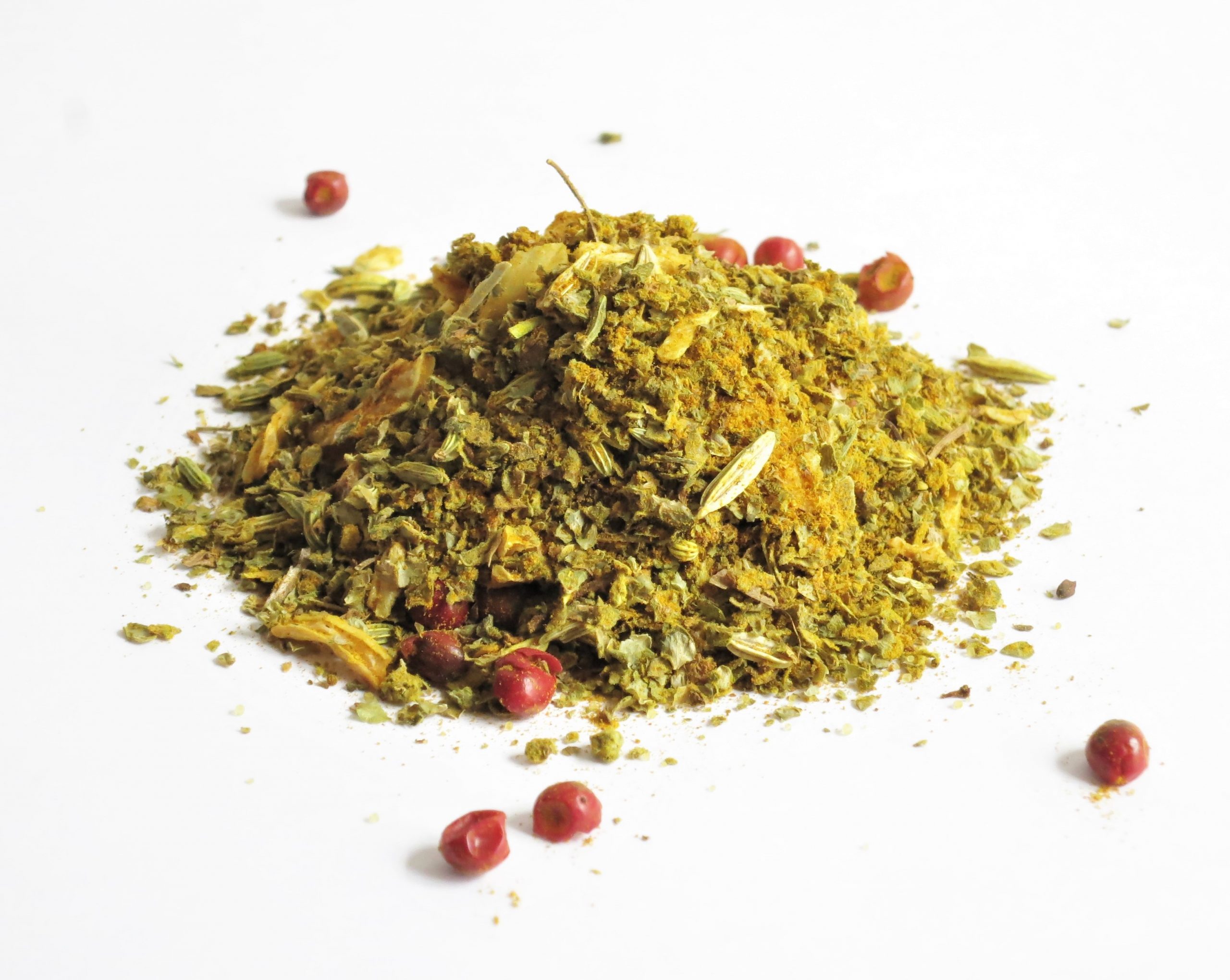 Marjolaine, baies roses, poivre blanc, sel de céleri, fenouil, aneth, curcuma, oignon rose, herbes de Provence.