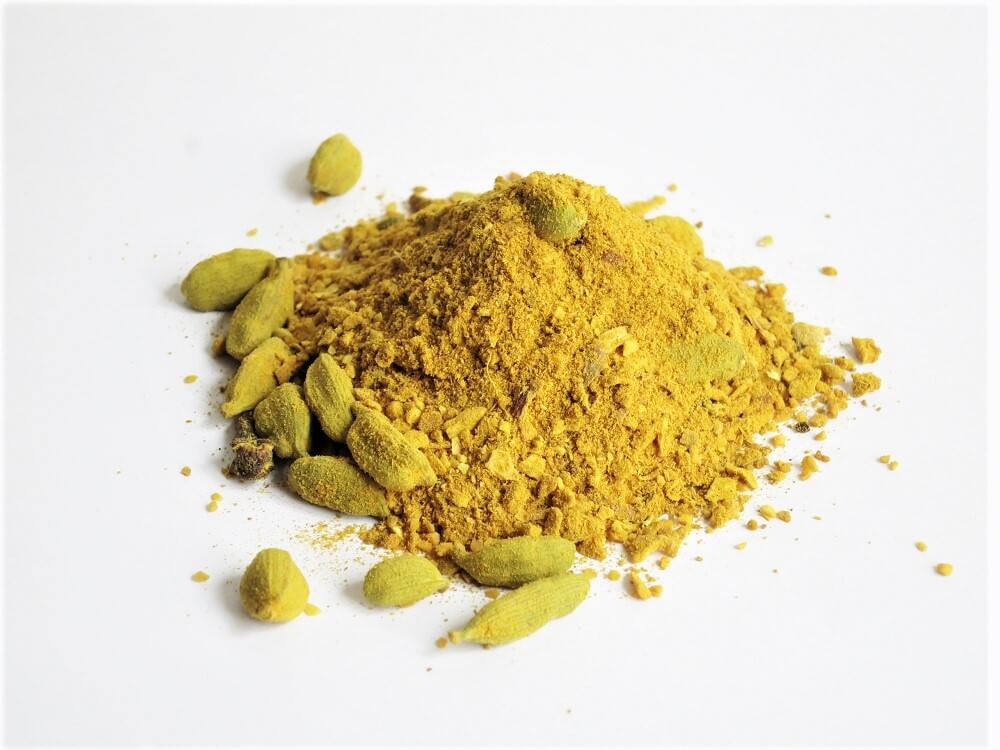 Oignon semoule, curcuma, ail, garam masala, gingembre, girofle et cardamome verte.