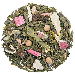 Thé vert, arôme, gouttes de caramel (sucre, beurre de cacao, lait entier en poudre, cacao en poudre, émulsifiant : lécithine, arôme naturel, colorant alimentaire extrait de paprika) (5%), morceaux de rhubarbe (3%), fleurs d’hibiscus blanches.